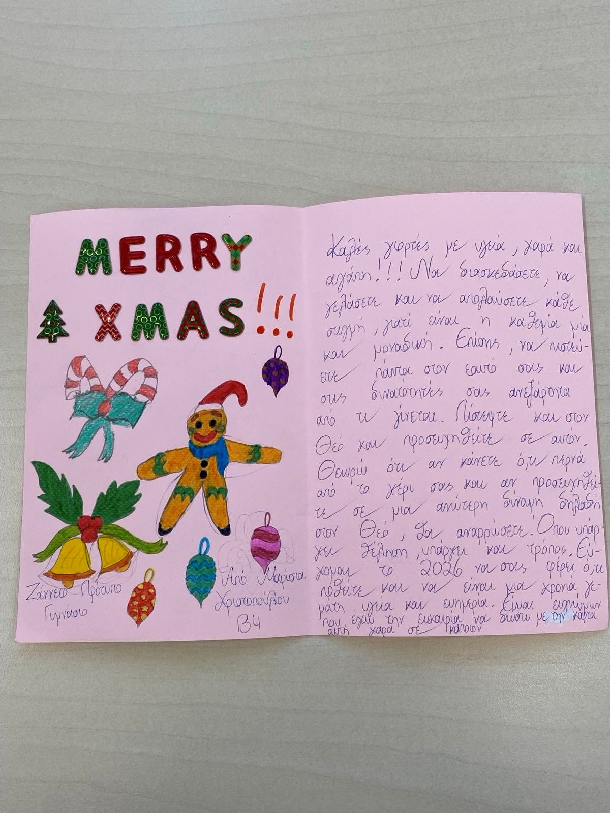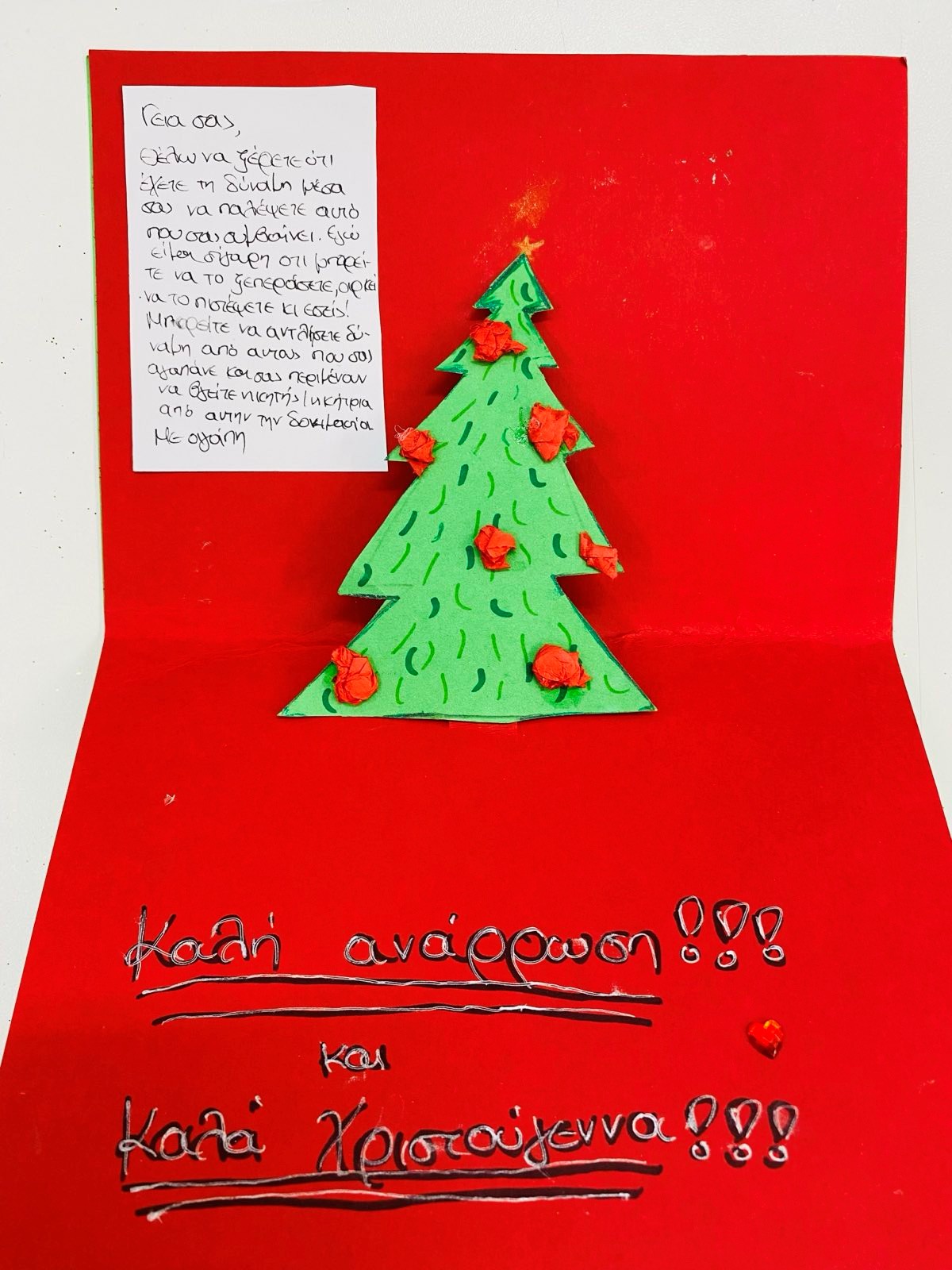 Φέτος το σχολείο μας είχε την χαρά να συμμετέχει στη δράση «Επισκεπτήριο Αγάπης» που διοργάνωσε η Αστική Μη Κερδοσκοπική Εταιρεία WinCancer, μετά από πρόταση της μητέρας της μαθήτριας Γεωργίας Ανδριώτη του τμήματος Γ΄1 κ. Αναστασίας, Τσιχλακίδου, Προϊσταμένης Τμήματος Κατ´ Οίκον Νοσηλείας ΓΑΝΠ Μεταξά. Mε υπεύθυνες καθηγήτριες τις Θεολόγους Αναστασία Βαβάση, Παρασκευή Φάββα και την Εικαστικό Χριστίνα Μπαλή, οι μαθητές και οι μαθήτριες δημιούργησαν συνολικά 176 κάρτες με ιδιαίτερο ενθουσιασμό και επιμέλεια. Μέσα από την δράση αυτή έστειλαν μια «μεγάλη αγκαλιά» θετικών μηνυμάτων και ευχών, ελπίζοντας να βοηθήσουν συναισθηματικά, να στολίσουν το κομοδίνο κάποιου πάσχοντος συνανθρώπου τους, να τον κάνουν να χαμογελάσει και να χαρεί, να ελπίσει, να νιώσει ότι κάποιο παιδί τον σκέφτηκε, αφιέρωσε χρόνο γι΄αυτόν και προσπάθησε να κάνει μια όμορφη κάρτα, για να του κρατήσει συντροφιά στο δωμάτιο του νοσοκομείου τις γιορτινές ημέρες που έρχονται.